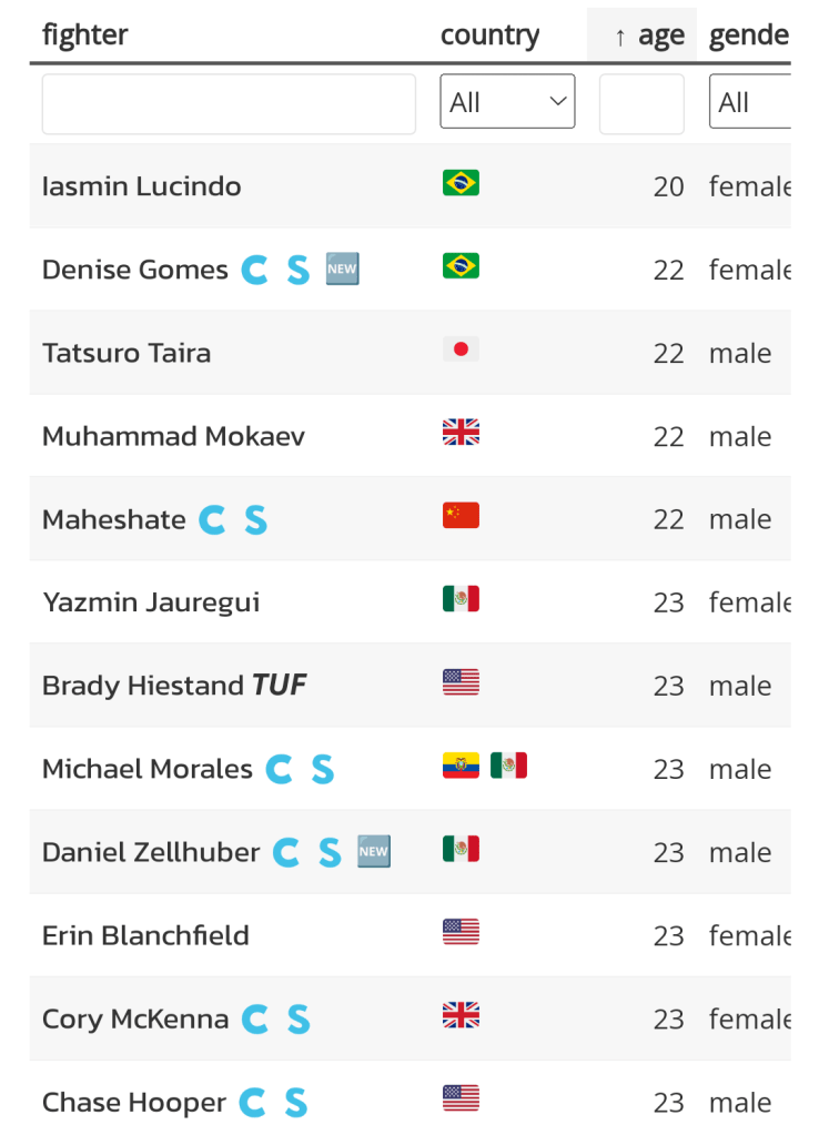 He will be the youngest overall fighter on the roster by 2+ years (Iasmin Lucindo is 20), and the youngest male fighter on the roster by 4+ years (Tatsuro Taira is 22).