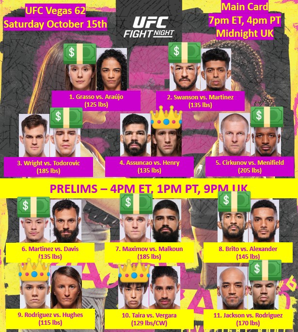 Below are my final picks and betting card for UFC Vegas 62. If you are looking for my more detailed information for this event, you can check out my full picks, predictions, and early bets.