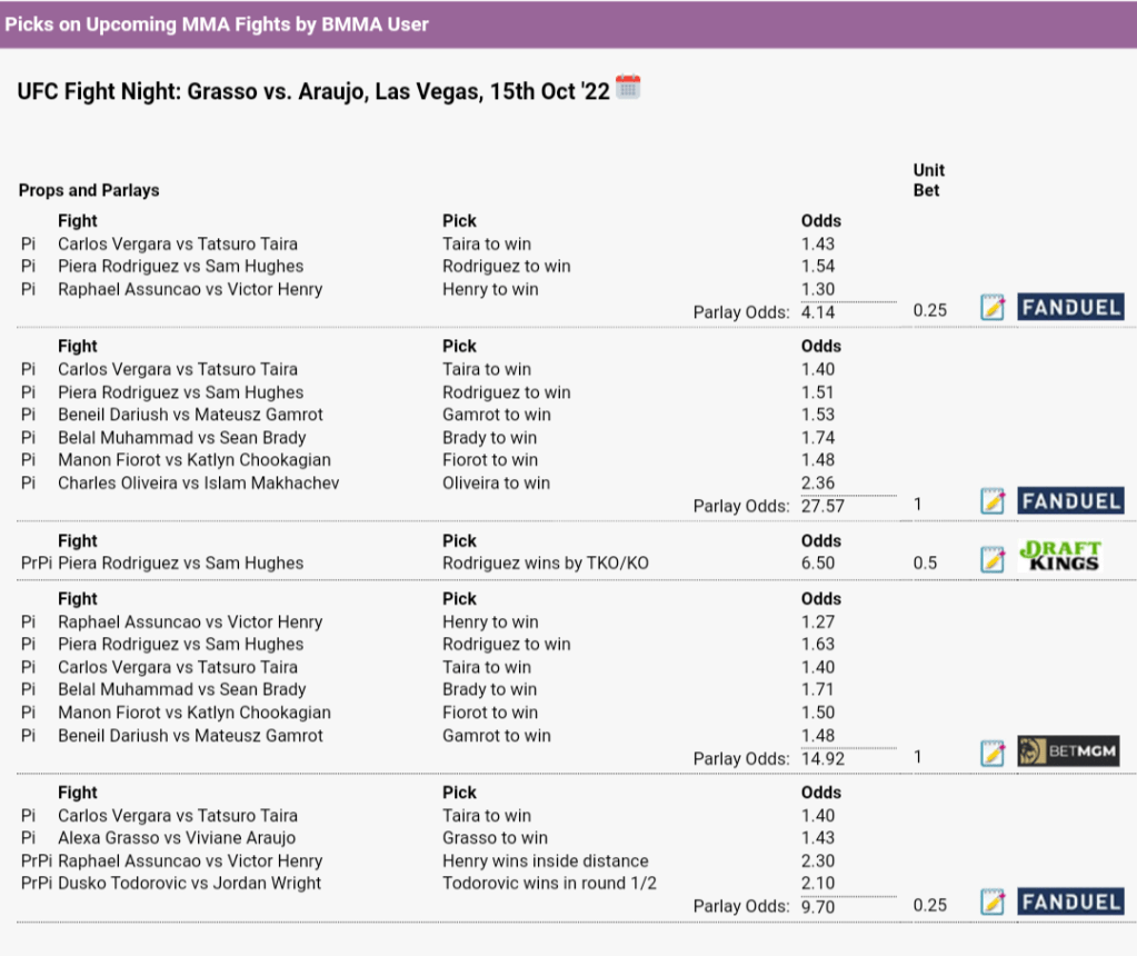 NOTE: The two one-unit plays are both parlays than begin with today’s UFC Vegas 62 event and run into next weekend’s UFC 280 card. Also, the Todorovic line for the bottom play should be the KO in R1/R2 prop, however, I couldn’t find it listed on BetMMA to properly display it.