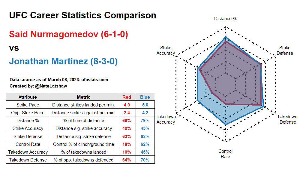 Jonathan Martinez – This should be one of the more entertaining fights of the card as 17-4 Martinez takes on 17-2 Said Nurmagomedov. Martinez has ten wins via stoppage, while Nurmagomedov has nine stoppages of his own. Both fighters are coming into this one on four-fight winning streaks and stoppage wins in their most recent fights. Both fighters are extremely dangerous strikers with positive strike differentials, but Nurmagomedov has absolutely terrible takedown accuracy, landing only 9% of his attempts. Martinez should be the slightly better striker in this matchup and will have the option to get this fight on the ground if he gets into trouble, whereas Nurmagomedov will likely be stuck on his feet with nowhere to go. Both fighters are durable so I expect this one to go the distance and Martinez should be able to squeeze this one out on the cards.