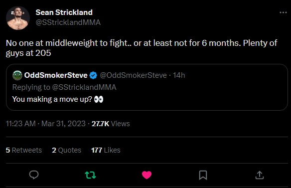 In response to a question on Twitter about if he was making a move up to 205 pounds, Strickland replied “No one at middleweight to fight… or at least not for 6 months. Plenty of guys at 205”.