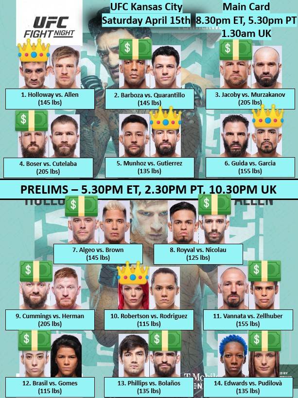 My favorite pick of this card is Max Holloway in the main event, and for a more detailed breakdown on that fight, be sure to check out my article for the WagerWire Community featuring my UFC Kansas City Pick and Favorite Bets for the main event. The other fighters I trust the most to get the job done on this weekend’s card are Chris Gutierrez, Rafa Garcia, and Gillian Robertson.