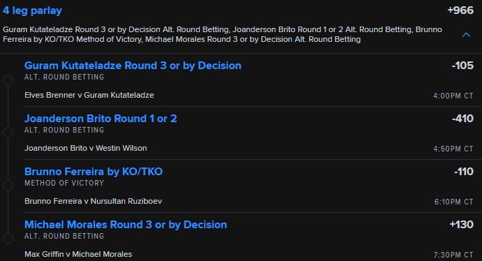 My favorite picks on this card are Joanderson Brito, Michael Morales, Guram Kutateladze, and Brunno Ferreira. With Brito and Kutateladze both being a bit pricy on the money line, I would recommend looking at props to get some better value there. I expect Brito to pick up his win sometime in the first two rounds, most likely by submission. Kutateladze could certainly win via an early stoppage too, however, I expect that one will go until the final round or to decision, making Kutateladze in R3/Decision a prop to consider.