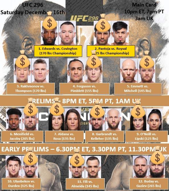 The final UFC event of 2023 arrives later today when UFC 296 takes place in Las Vegas. The card is headlined by two championship fights and actually has a very deep lineup even after losing two fights during the week. The main event features Leon Edwards defending his UFC Welterweight title against Colby Covington, while Alexandre Pantoja will be defending his UFC Flyweight title for the first time against Brandon Royval in their second meeting against each other. In what feels like a rarity these days, we had zero weight misses for the event yesterday, which is always a plus.