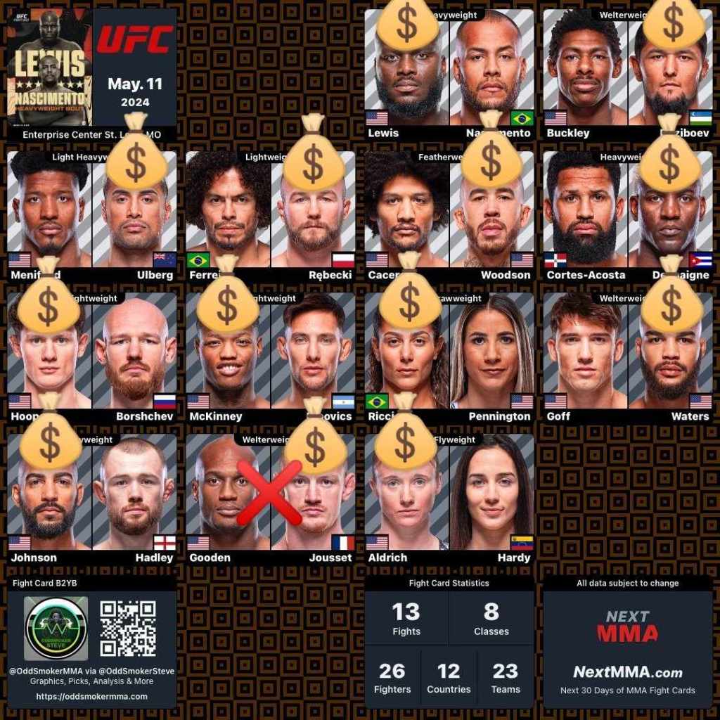 For the betting card today, I kept things pretty light with two small parlays, four prop bets and a longshot parlay. The first two parlays: Derrick Lewis ML + Robelis Despaigne ML + Mateusz Rebecki ML (+270 for .5 units) and Rebecki to Win Inside the Distance + Lewis by R1/2 KO/TKO (+289 for .5 units). The prop bets: Carlos Ulberg by Decision (+350 for .5 units), Ricci/Torres to End by Split/Majority Decision (+250 for .5 units), Nursulton Ruziboev by R1/2 KO/TKO (+490 for .25 units) and Despaigne by R2 KO/TKO (+750 for .25 units). The longshot parlay: Terrance McKinney by R1/2 Submission + Rebecki ITD + Lewis R1/2 KO/TKO (+2235 for .25 units). That’s a total of 2.75 units out across the seven bets. Since I’m here in St. Louis for the event, I won’t be able to add anything to the card late. I hope everyone enjoys the fights and best of luck to the bettors!