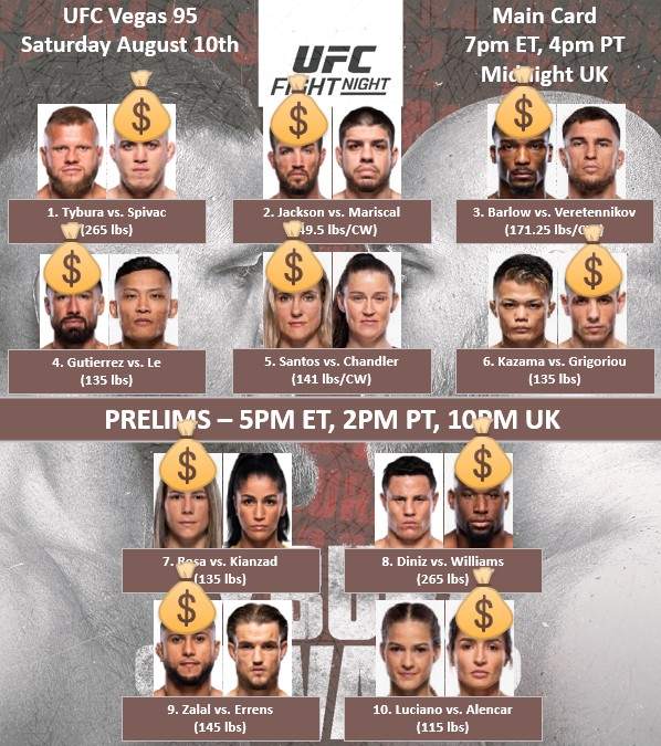 We’re back today for UFC Vegas 95 at the Apex, and despite a few weigh-in misses yesterday and a small lineup with only ten fights, it should still be a pretty fun card overall. The main event features a heavyweight rematch between Marcin Tybura and Sergei Spivac that likely won’t have much effect on the title picture in the division but should keep the winner firmly in the top ten. There were three weight misses yesterday for the card: Danny Barlow was 0.25 lb over, Chepe Mariscal was 3.5 lb over and Chelsea Chandler was a whopping 5 lb over the limit. All three bouts involving those fighters have remained intact and are still scheduled to proceed.