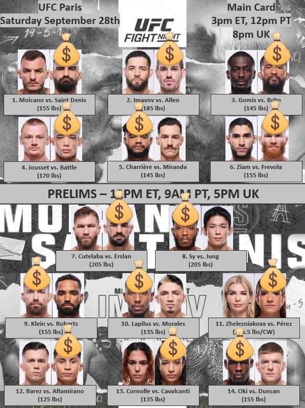 Overall, I’m pretty excited for this card, particularly from a viewing standpoint. Paris has traditionally had pretty great and energetic crowds in recent years when the UFC has visited the city, and I expect it to continue with this one. Be sure to join us next weekend for UFC 307 with Alex Pereira defending his UFC Light Heavyweight title against Khalil Rountree Jr in the main event from Salt Lake City. Let us know down below in the comments who you’re liking and/or betting on this weekend. Best of luck to everyone on their bets and enjoy the fights!