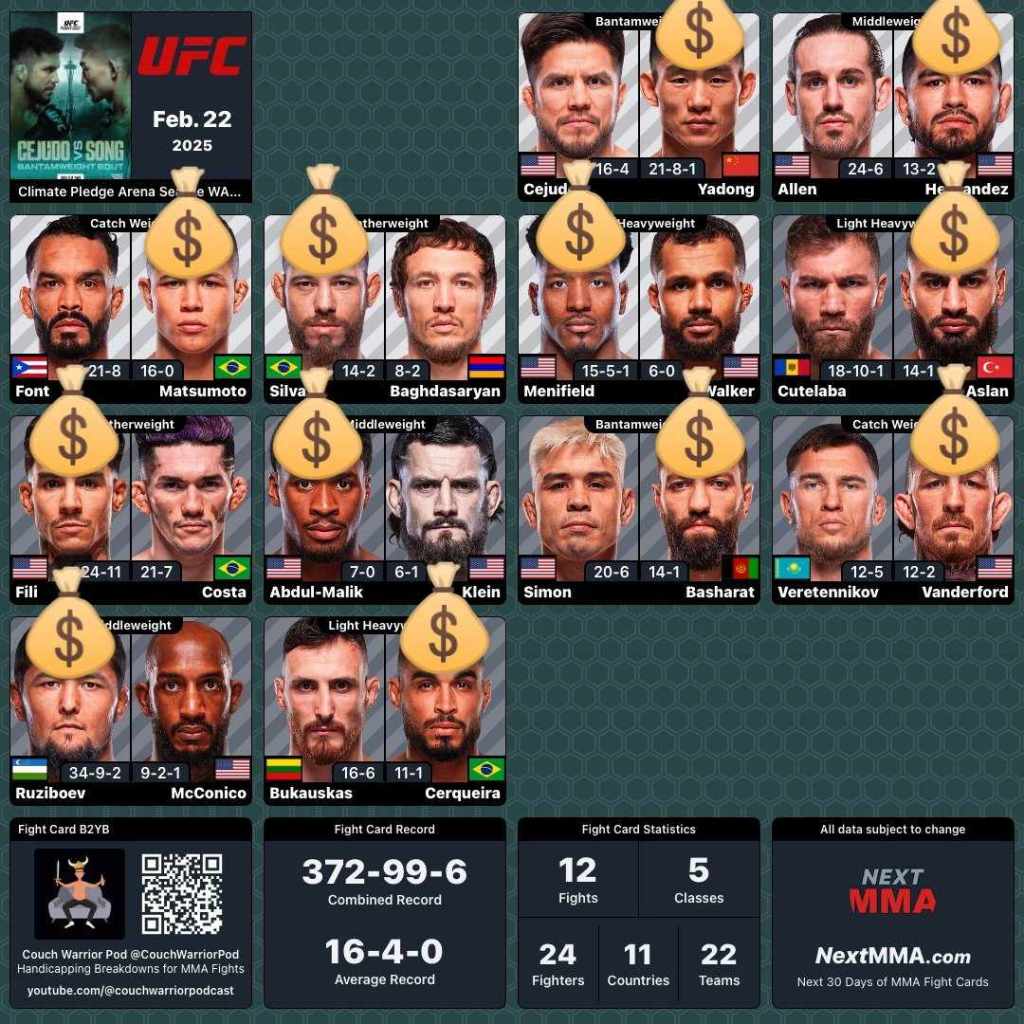For the betting card this weekend, I have three straight bets out and three parlays. The straight bets are: Cerqueira ML (+270 for .5 units), Jean Silva by Submission (+650 for .25 units), and Basharat/Simon to End by Split/Majority Dec (+500 for .25 units). The parlays are Vanderford ML + Aslan ML (+198 for .5 units), Abdul-Malik by R1 KO/TKO + Aslan ML + Jean Silva to Win Inside the Distance (+349 for .5 units) and the ML’s for the three picks in Chris’ video (+128 for 1 unit).