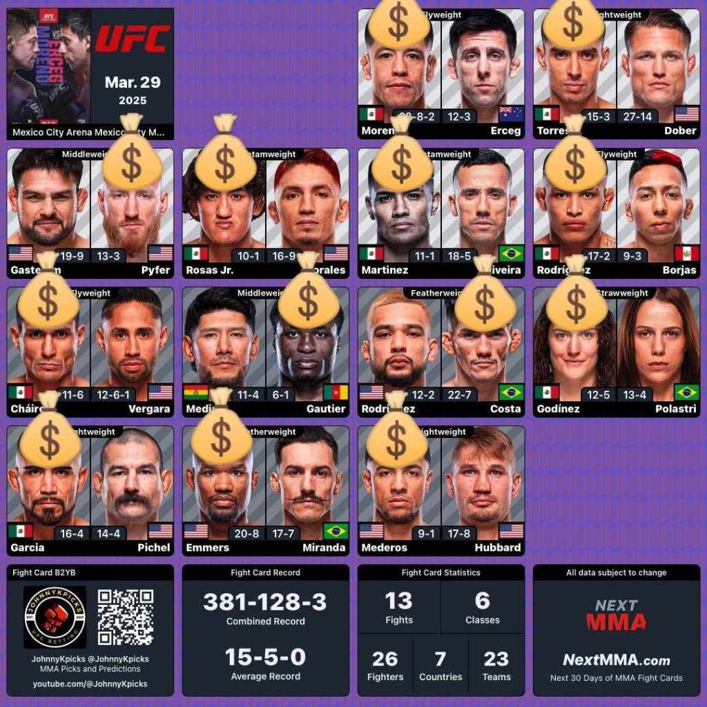 My favorite picks for this card are Raul Rosas Jr, David Martinez, Brandon Moreno and Joe Pyfer. My favorite potential betting upset is Melquizael Costa on an otherwise pretty chalky card. Be sure to keep the elevation of Mexico City in mind with the bets today as it’s likely going to have an effect on the cardio of at least a few fighters.