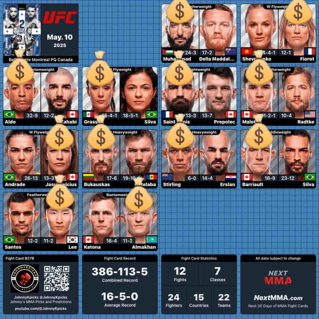 It’s Fight Day for UFC 315 from Montreal! We have a pair of title fights at the top of the card with Belal Muhammad and Jack Della Maddalena for the UFC Welterweight championship and Valentina Shevchenko taking on Manan Fiorot for the UFC Women’s Flyweight title to begin her second reign as champion. We only had one official weight miss (Bruno Silva one pound over the middleweight limit), however, Jose Aldo and Aiemann Zahabi was moved to featherweight after Aldo struggled with his cut.